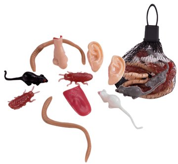 A net bag filled with squishy, sticky body parts, insects and rats will horrify those with a weak stomach. Pieces range in size from 1 to 4 inches.